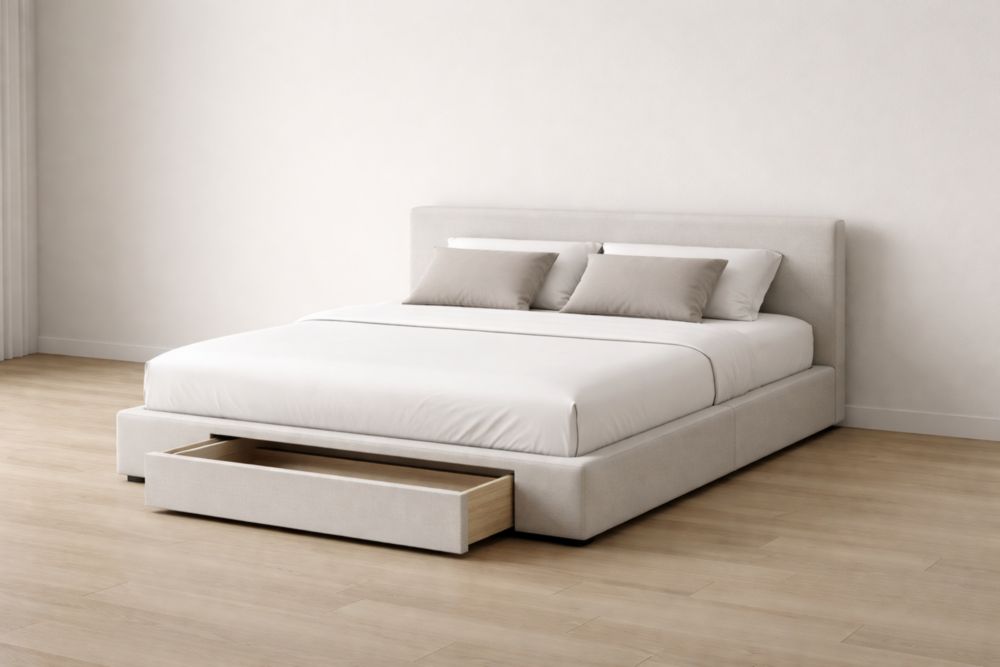 Letto matrimoniale con cassetto contenitore in tessuto beige