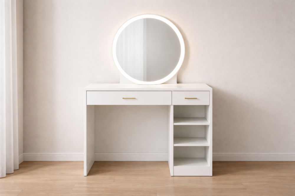 Consolle con Specchio Rotondo LED in Legno Bianco con Cassetto e Ripiani
